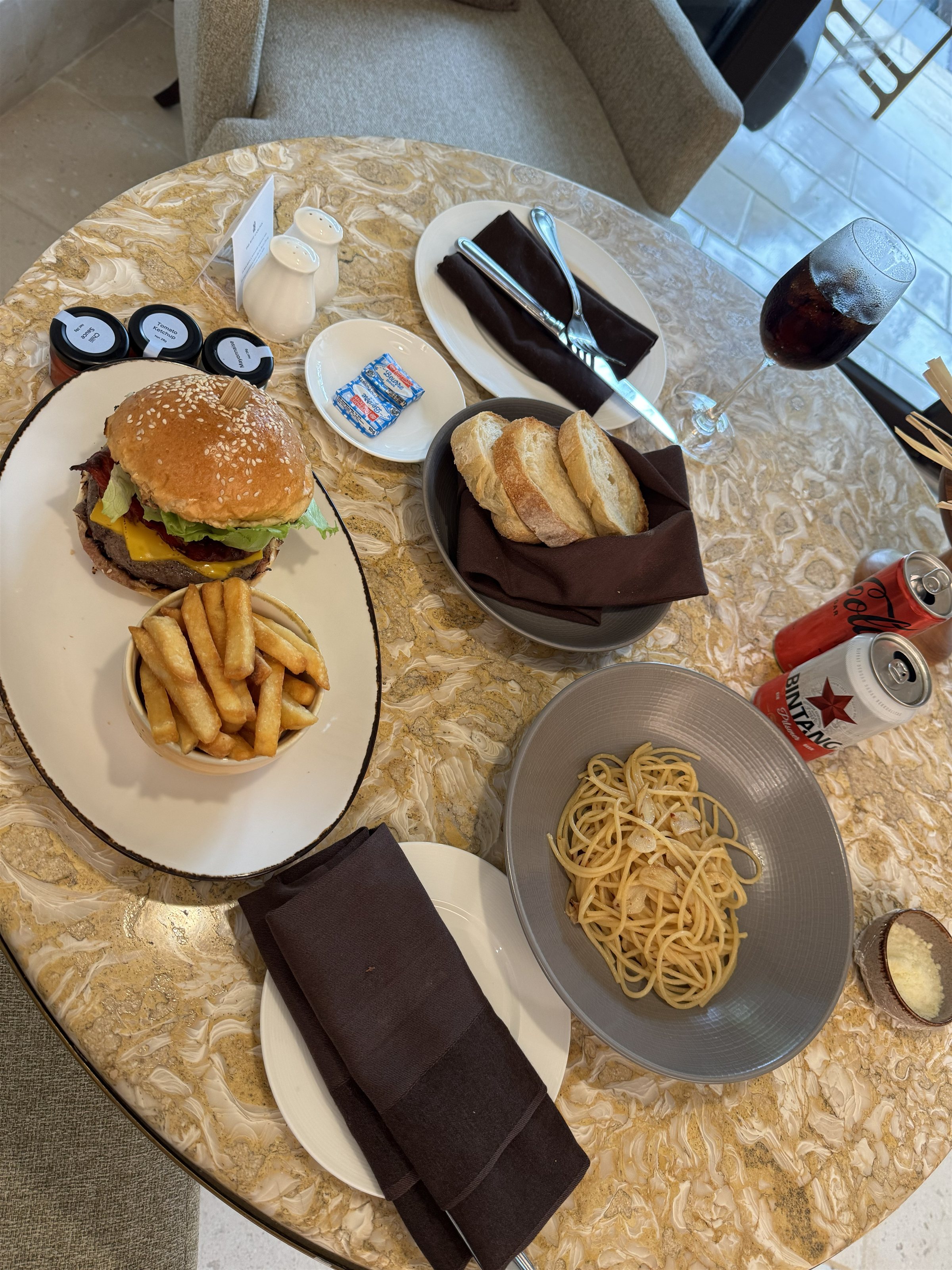 今回はハンバーガーとパスタを注文。
