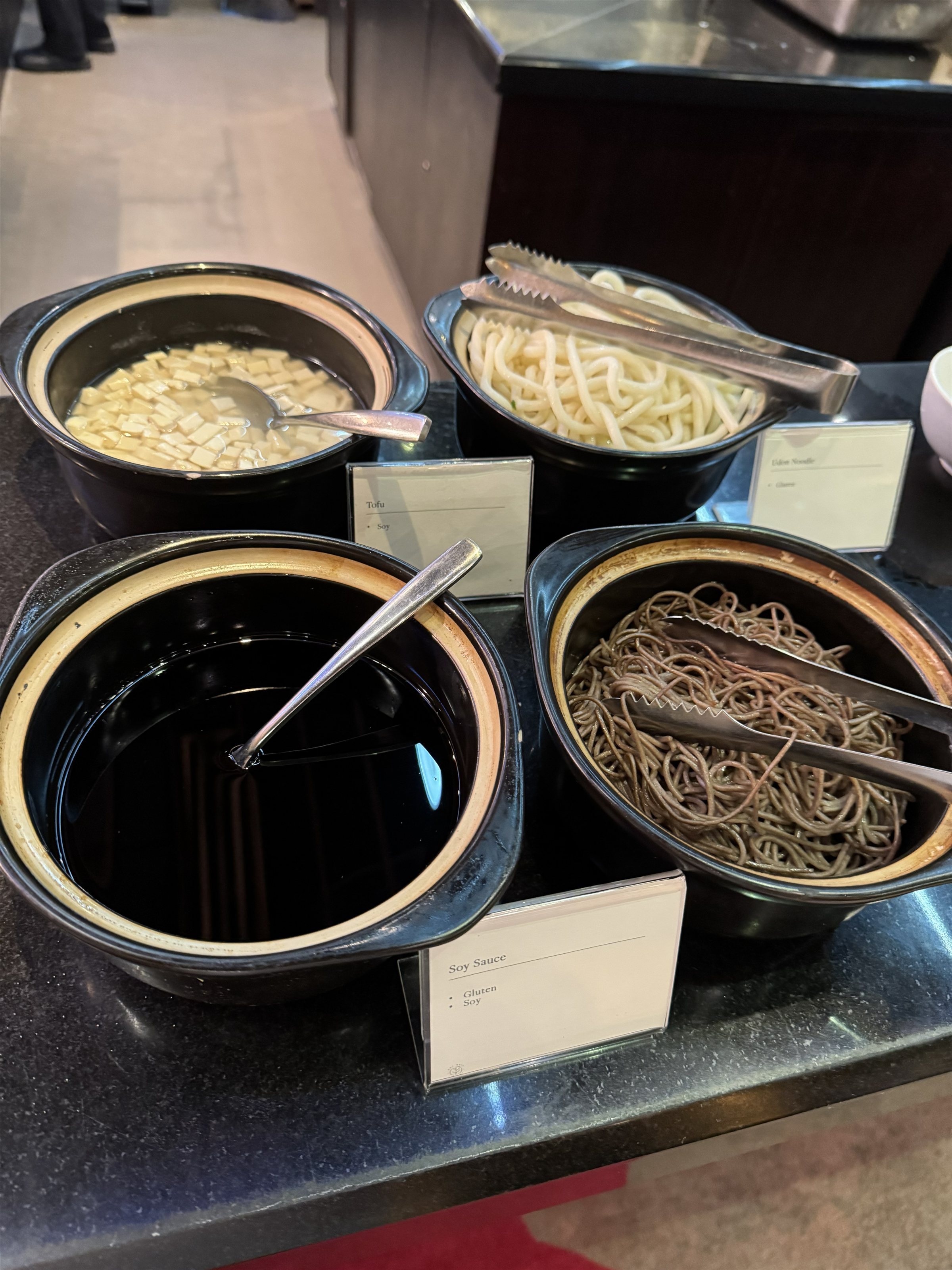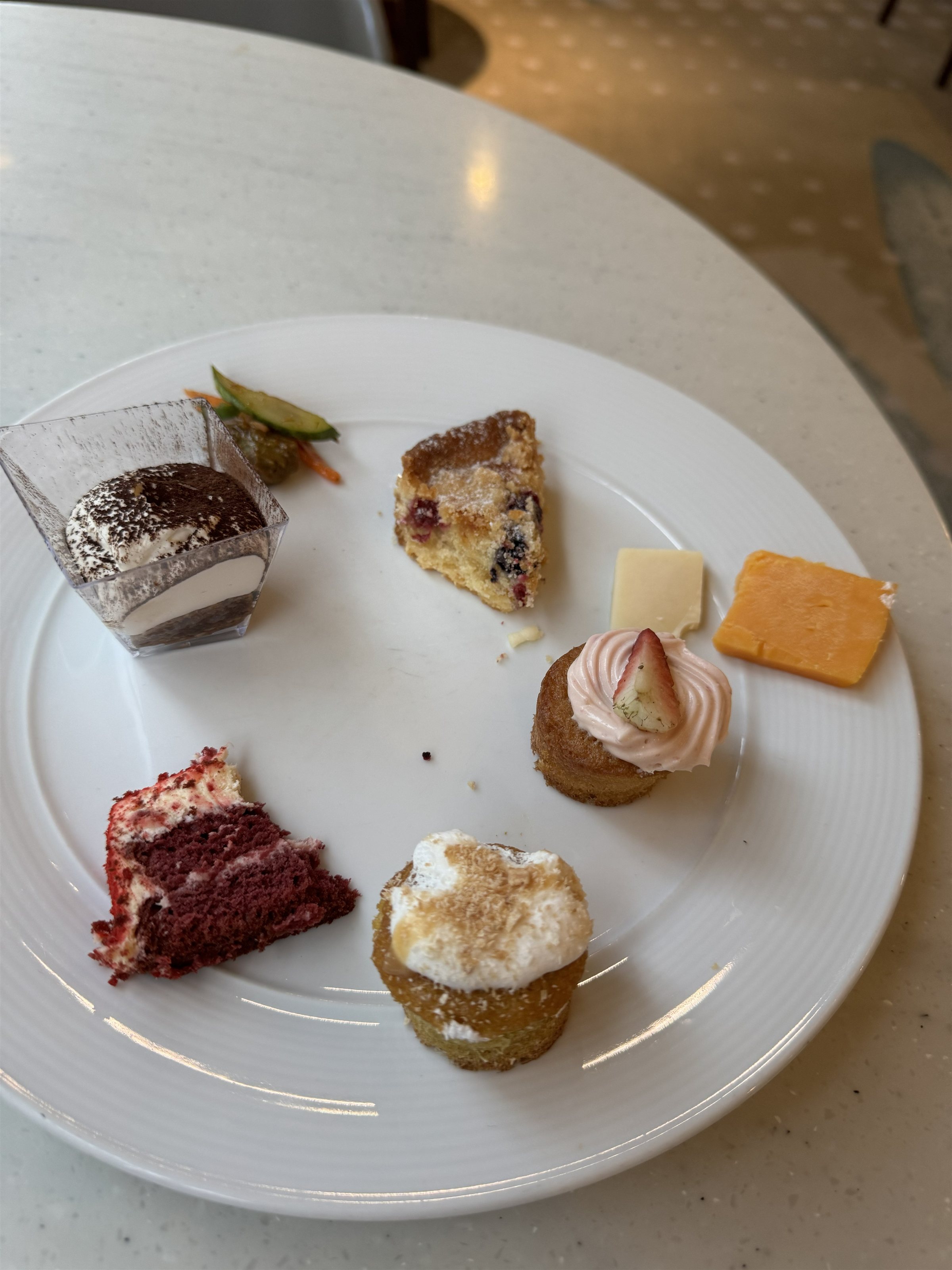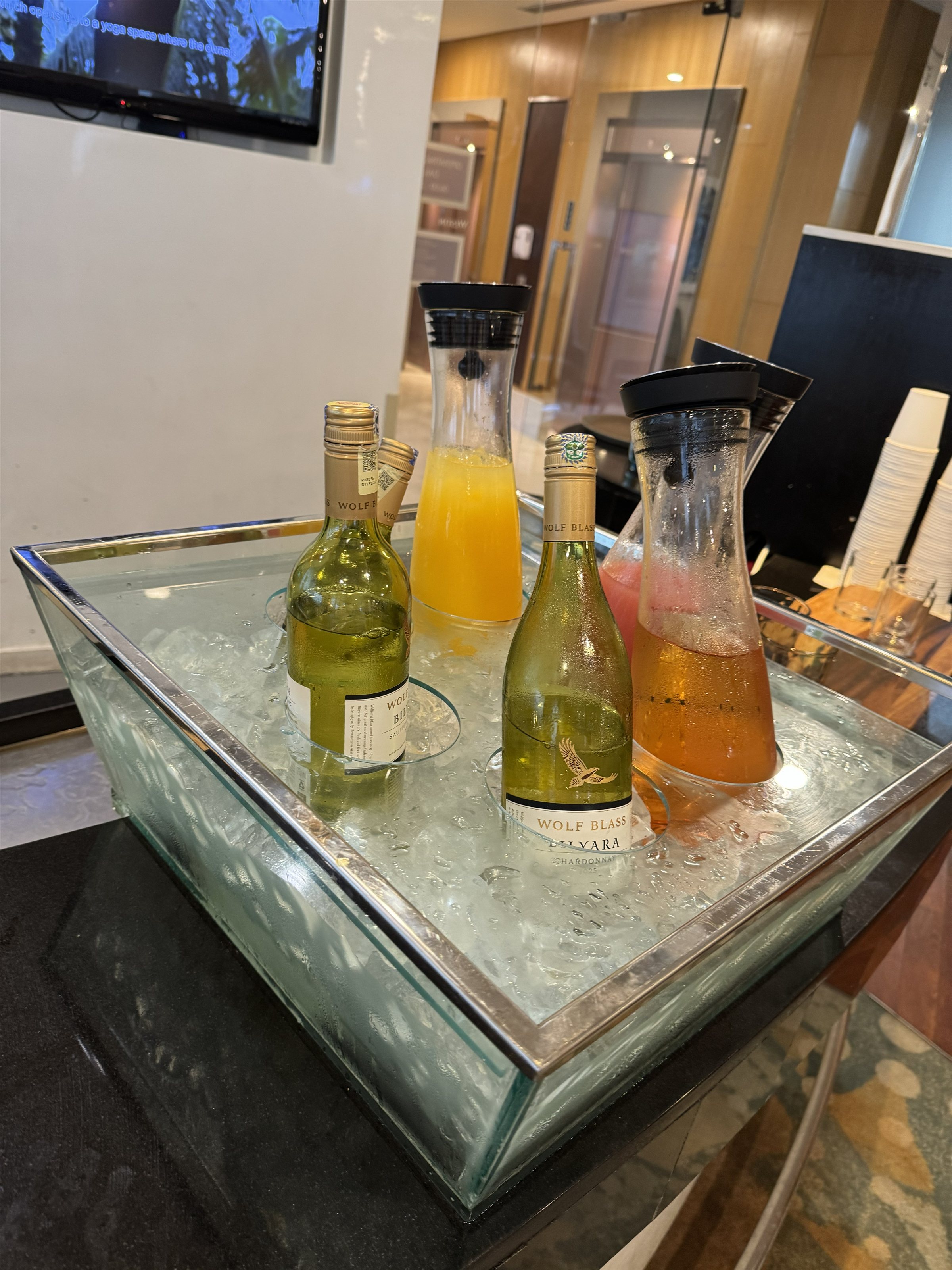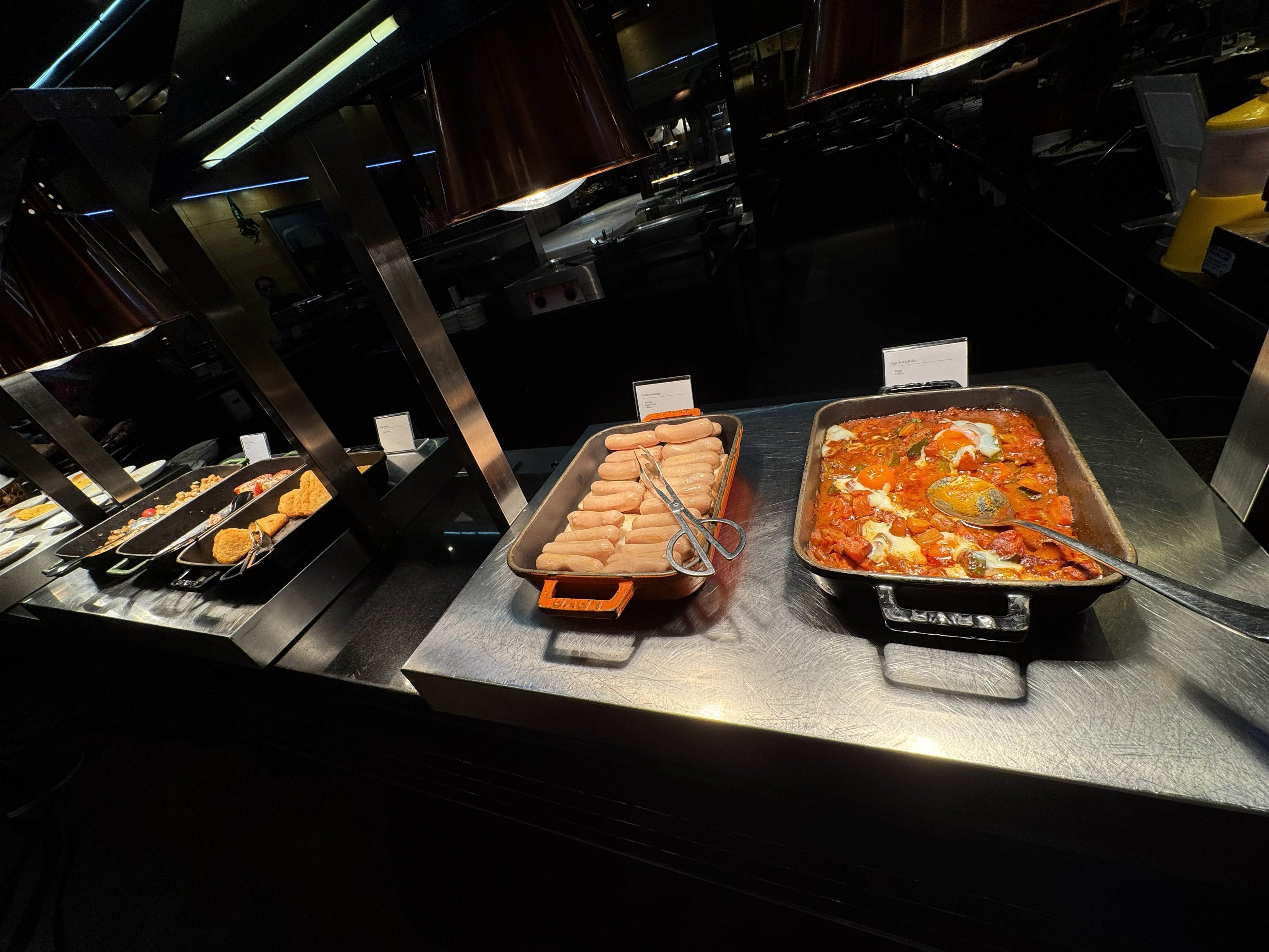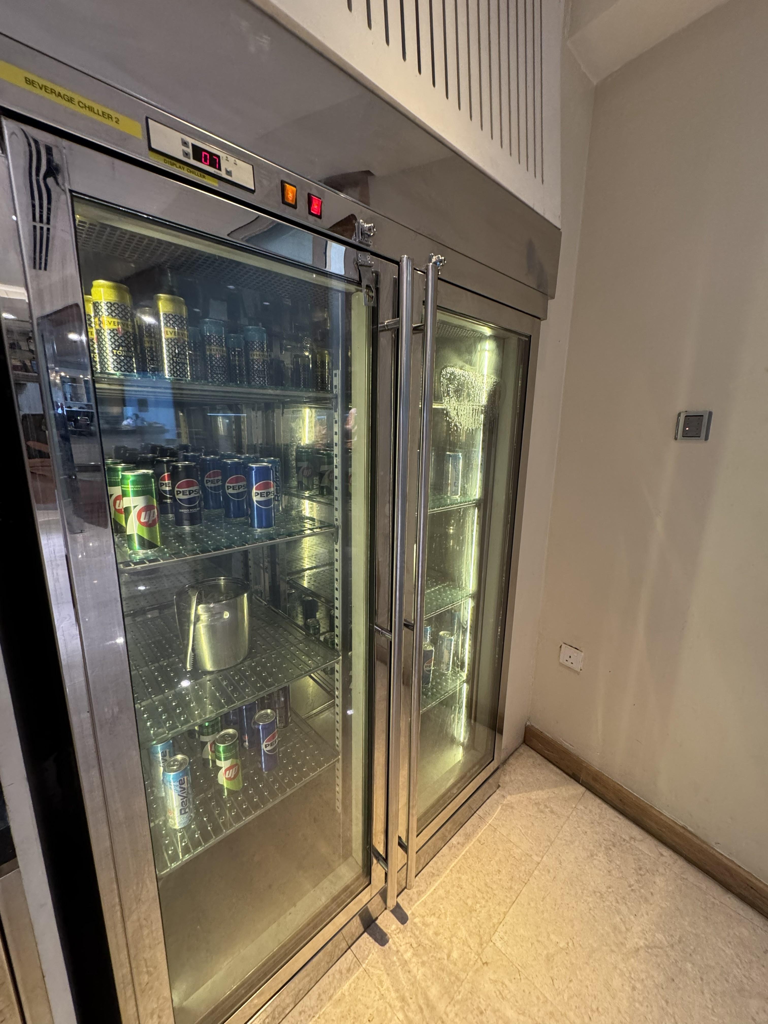 サラダ、サンドイッチ、ケーキ、スコーンなどがありました。コーラなどの缶ジュース系はバーの中にあるので、自由に取れるシステムでは無いです。持ち帰り対策かな?バーテンの人に欲しいって伝えないといけないので結構面倒です笑